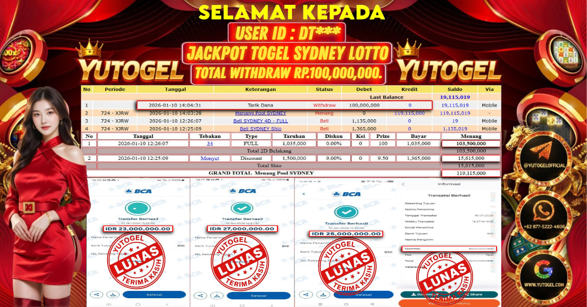 Selamat kepada USER ID : DT*** Telah berhasil mendapatkan kemenangan besar pada YUTOGEL JACKPOT TOGEL SYDNEY LOTTO RP. 100.000.000,. – LUNAS. Setelah mengisi formulir withdraw dengan kurung waktu hanya 5 – 10 menit pihak sudah melakukan transfer kepada pemilik User id dan dana sudah dapat dicairkan oleh pemenang. Bukti pembayaran yang kami berikan merupakan bukti pembayaran yang SAH/VALID yang langsung di dapatkan melalui tanda transfer transaksi dari Bank yang dituju.