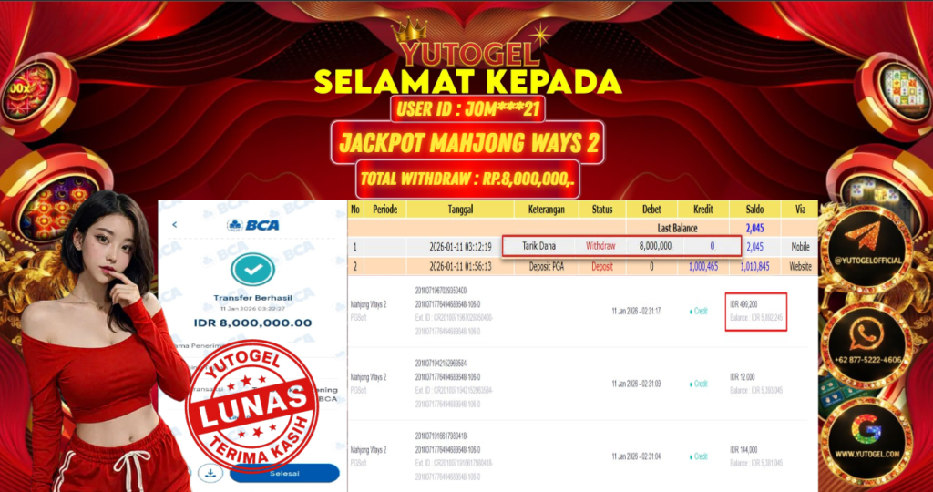 Selamat kepada USER ID : J0M***21 Telah berhasil mendapatkan kemenangan besar pada YUTOGEL JACKPOT SLOT PGSOFT MAHJONG 2 WAYS RP. 8.000.000,. – LUNAS. Setelah mengisi formulir withdraw dengan kurung waktu hanya 5 – 10 menit pihak sudah melakukan transfer kepada pemilik User id dan dana sudah dapat dicairkan oleh pemenang. Bukti pembayaran yang kami berikan merupakan bukti pembayaran yang SAH/VALID yang langsung di dapatkan melalui tanda transfer transaksi dari Bank yang dituju.