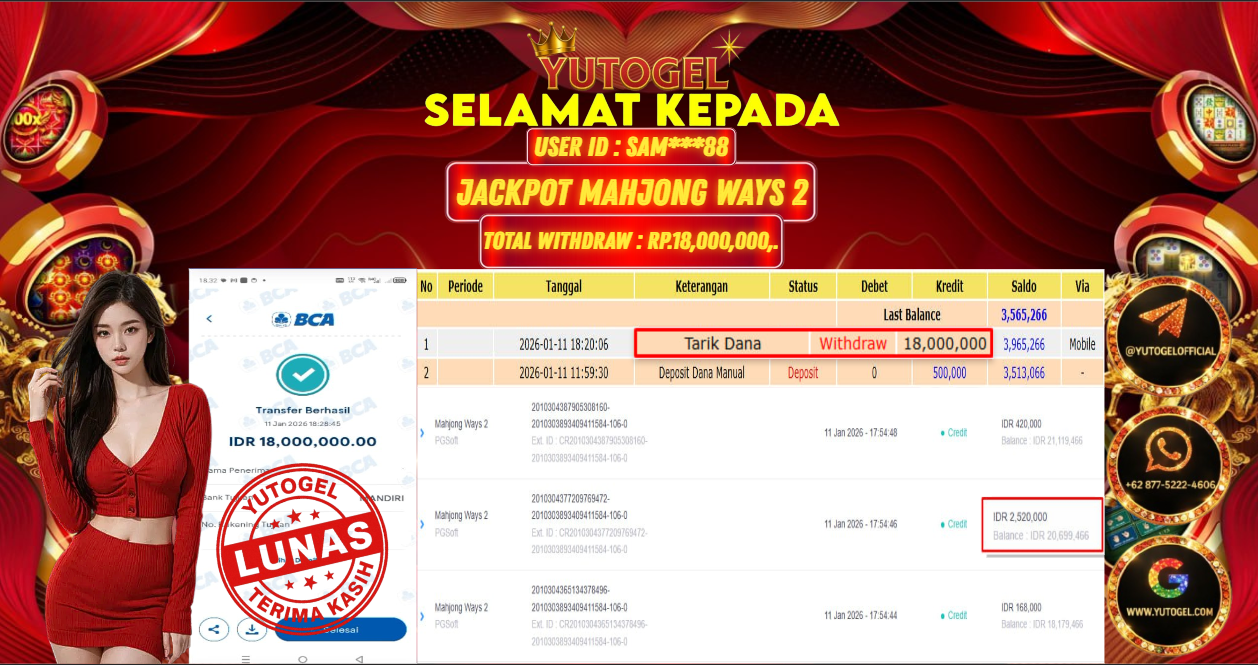Selamat kepada USER ID : SAM***88 Telah berhasil mendapatkan kemenangan besar pada YUTOGEL JACKPOT SLOT PGSOFT MAHJONG 2 WAYS RP. 18.000.000,. – LUNAS. Setelah mengisi formulir withdraw dengan kurung waktu hanya 5 – 10 menit pihak sudah melakukan transfer kepada pemilik User id dan dana sudah dapat dicairkan oleh pemenang. Bukti pembayaran yang kami berikan merupakan bukti pembayaran yang SAH/VALID yang langsung di dapatkan melalui tanda transfer transaksi dari Bank yang dituju.