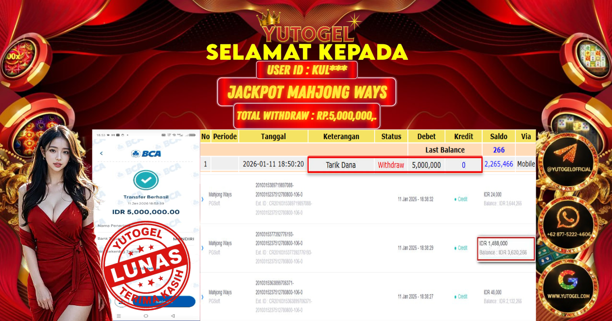 Selamat kepada USER ID : KUL*** Telah berhasil mendapatkan kemenangan besar pada YUTOGEL JACKPOT SLOT PGSOFT MAHJONG WAYS RP. 5.000.000,. – LUNAS. Setelah mengisi formulir withdraw dengan kurung waktu hanya 5 – 10 menit pihak sudah melakukan transfer kepada pemilik User id dan dana sudah dapat dicairkan oleh pemenang. Bukti pembayaran yang kami berikan merupakan bukti pembayaran yang SAH/VALID yang langsung di dapatkan melalui tanda transfer transaksi dari Bank yang dituju.
