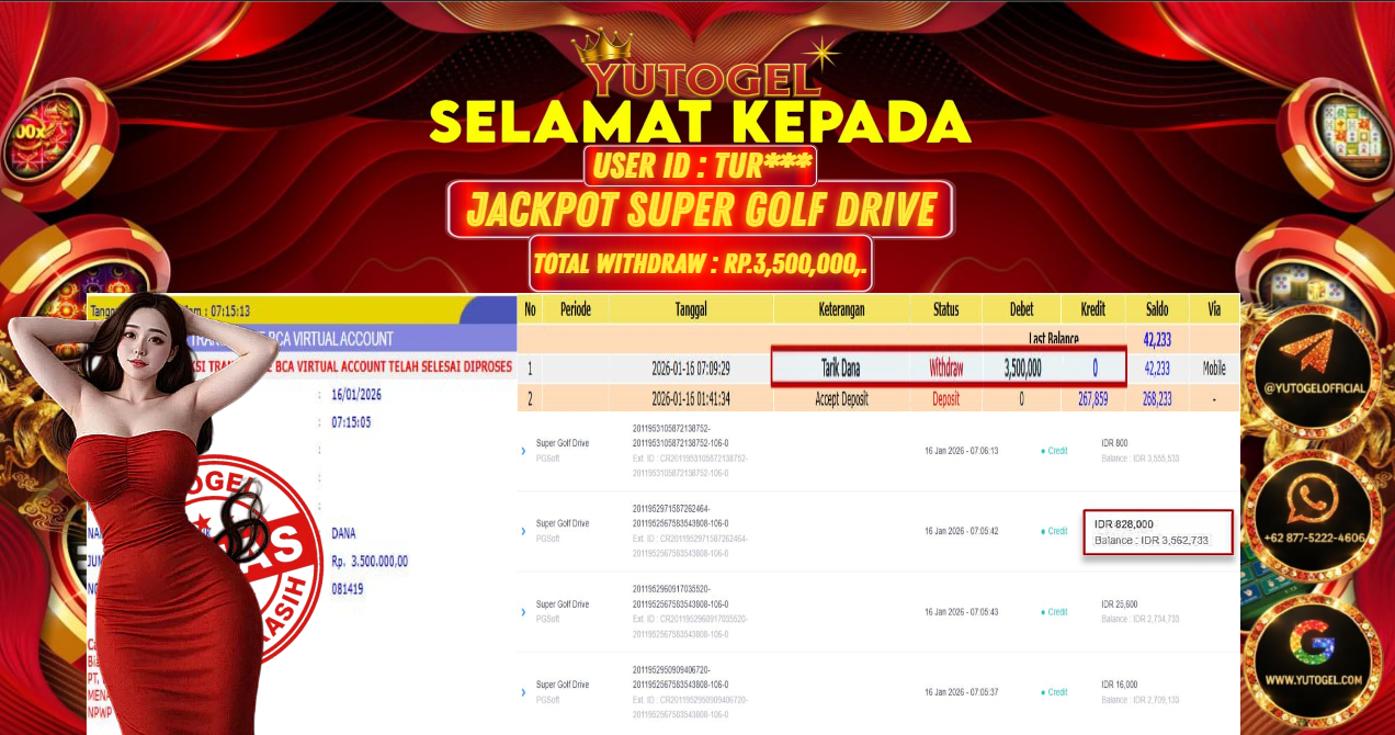 Selamat kepada USER ID : TUR*** Telah berhasil mendapatkan kemenangan besar pada YUTOGEL JACKPOT SLOT PGSOFT SUPER GOLF DRIVE RP. 3.500.000,. – LUNAS. Setelah mengisi formulir withdraw dengan kurung waktu hanya 5 – 10 menit pihak sudah melakukan transfer kepada pemilik User id dan dana sudah dapat dicairkan oleh pemenang. Bukti pembayaran yang kami berikan merupakan bukti pembayaran yang SAH/VALID yang langsung di dapatkan melalui tanda transfer transaksi dari Bank yang dituju.