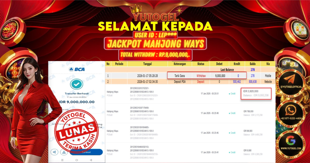 Selamat kepada USER ID : LEP*** Telah berhasil mendapatkan kemenangan besar pada YUTOGEL JACKPOT SLOT PGSOFT MAHJONG WAYS RP. 9.000.000,. – LUNAS. Setelah mengisi formulir withdraw dengan kurung waktu hanya 5 – 10 menit pihak sudah melakukan transfer kepada pemilik User id dan dana sudah dapat dicairkan oleh pemenang. Bukti pembayaran yang kami berikan merupakan bukti pembayaran yang SAH/VALID yang langsung di dapatkan melalui tanda transfer transaksi dari Bank yang dituju.