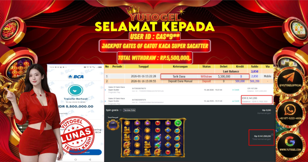 Selamat kepada USER ID : CAS*9*** Telah berhasil mendapatkan kemenangan besar pada YUTOGEL JACKPOT SLOT PRAGMATIC GATES OF GATOT KACA SUPER SACTTER RP. 5.500.000,. – LUNAS. Setelah mengisi formulir withdraw dengan kurung waktu hanya 5 – 10 menit pihak  sudah melakukan transfer kepada pemilik User id dan dana sudah dapat dicairkan oleh pemenang. Bukti pembayaran yang kami berikan merupakan bukti pembayaran yang SAH/VALID yang langsung di dapatkan melalui tanda transfer transaksi dari Bank yang dituju.