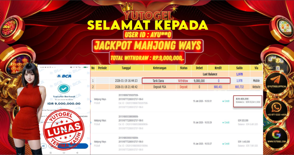 Selamat kepada USER ID : AYU**0 Telah berhasil mendapatkan kemenangan besar pada YUTOGEL JACKPOT SLOT PGSOFT MAHJONG WAYS RP. 9.000.000,. – LUNAS. Setelah mengisi formulir withdraw dengan kurung waktu hanya 5 – 10 menit pihak sudah melakukan transfer kepada pemilik User id dan dana sudah dapat dicairkan oleh pemenang. Bukti pembayaran yang kami berikan merupakan bukti pembayaran yang SAH/VALID yang langsung di dapatkan melalui tanda transfer transaksi dari Bank yang dituju.
