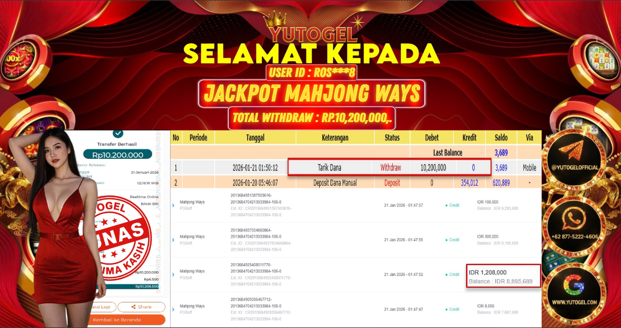 Selamat kepada USER ID : ROS***8 Telah berhasil mendapatkan kemenangan besar pada YUTOGEL JACKPOT SLOT PGSOFT MAHJONG WAYS RP. 10.200.000,. – LUNAS. Setelah mengisi formulir withdraw dengan kurung waktu hanya 5 – 10 menit pihak sudah melakukan transfer kepada pemilik User id dan dana sudah dapat dicairkan oleh pemenang. Bukti pembayaran yang kami berikan merupakan bukti pembayaran yang SAH/VALID yang langsung di dapatkan melalui tanda transfer transaksi dari Bank yang dituju.