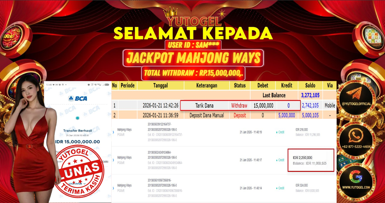Selamat kepada USER ID : SAM*** Telah berhasil mendapatkan kemenangan besar pada YUTOGEL JACKPOT SLOT PGSOFT MAHJONG WAYS RP. 15.000.000,. – LUNAS. Setelah mengisi formulir withdraw dengan kurung waktu hanya 5 – 10 menit pihak sudah melakukan transfer kepada pemilik User id dan dana sudah dapat dicairkan oleh pemenang. Bukti pembayaran yang kami berikan merupakan bukti pembayaran yang SAH/VALID yang langsung di dapatkan melalui tanda transfer transaksi dari Bank yang dituju.