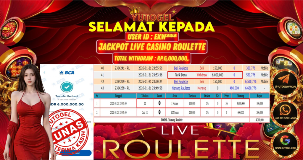 Selamat kepada USER ID : EKW*** Telah berhasil mendapatkan kemenangan besar pada YUTOGEL JACKPOT ROULETTE LIVE GAMES RP. 6.000.000,. – LUNAS. Setelah mengisi formulir withdraw dengan kurung waktu hanya 5 – 10 menit pihak sudah melakukan transfer kepada pemilik User id dan dana sudah dapat dicairkan oleh pemenang. Bukti pembayaran yang kami berikan merupakan bukti pembayaran yang SAH/VALID yang langsung di dapatkan melalui tanda transfer transaksi dari Bank yang dituju.
