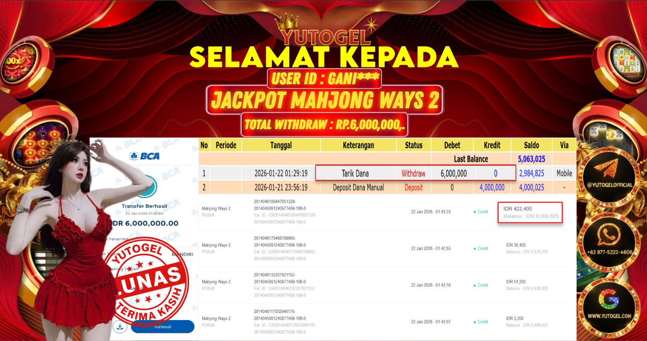 Selamat kepada USER ID : GANI*** Telah berhasil mendapatkan kemenangan besar pada YUTOGEL JACKPOT SLOT PGSOFT MAHJONG WAYS 2 RP. 6.000.000,. – LUNAS. Setelah mengisi formulir withdraw dengan kurung waktu hanya 5 – 10 menit pihak sudah melakukan transfer kepada pemilik User id dan dana sudah dapat dicairkan oleh pemenang. Bukti pembayaran yang kami berikan merupakan bukti pembayaran yang SAH/VALID yang langsung di dapatkan melalui tanda transfer transaksi dari Bank yang dituju.