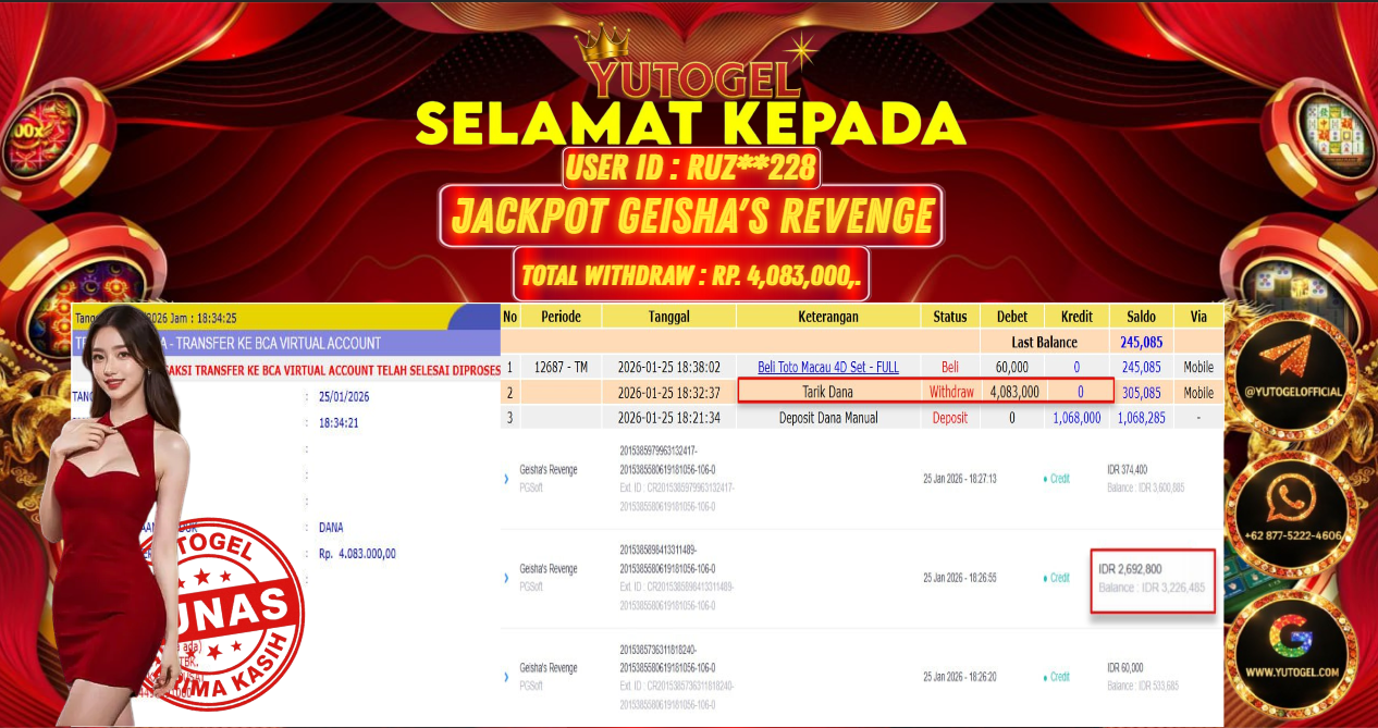 Selamat kepada USER ID : RUZ**228 Telah berhasil mendapatkan kemenangan besar pada YUTOGEL JACKPOT SLOT PGSOFT GEISHA’S REVENGE RP. 4.083.000,. – LUNAS. Setelah mengisi formulir withdraw dengan kurung waktu hanya 5 – 10 menit pihak  sudah melakukan transfer kepada pemilik User id dan dana sudah dapat dicairkan oleh pemenang. Bukti pembayaran yang kami berikan merupakan bukti pembayaran yang SAH/VALID yang langsung di dapatkan melalui tanda transfer transaksi dari Bank yang dituju.