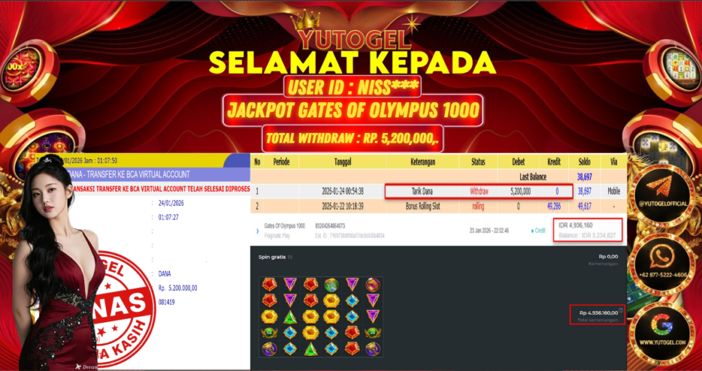 Selamat kepada USER ID : NISS*** Telah berhasil mendapatkan kemenangan besar pada YUTOGEL JACKPOT SLOT PRAGMATIC PLAY GATES OF OLYMPUS 1000 RP. 5.200.000,. – LUNAS. Setelah mengisi formulir withdraw dengan kurung waktu hanya 5 – 10 menit pihak sudah melakukan transfer kepada pemilik User id dan dana sudah dapat dicairkan oleh pemenang. Bukti pembayaran yang kami berikan merupakan bukti pembayaran yang SAH/VALID yang langsung di dapatkan melalui tanda transfer transaksi dari Bank yang dituju.