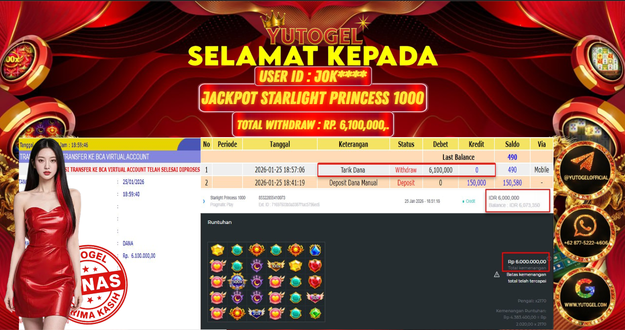 Selamat kepada USER ID : JOK**** Telah berhasil mendapatkan kemenangan besar pada YUTOGEL JACKPOT SLOT PRAGMATIC PLAY STARLIGHT PRINCESS 1000 RP. 6.100.000,. – LUNAS. Setelah mengisi formulir withdraw dengan kurung waktu hanya 5 – 10 menit pihak sudah melakukan transfer kepada pemilik User id dan dana sudah dapat dicairkan oleh pemenang. Bukti pembayaran yang kami berikan merupakan bukti pembayaran yang SAH/VALID yang langsung di dapatkan melalui tanda transfer transaksi dari Bank yang dituju.
