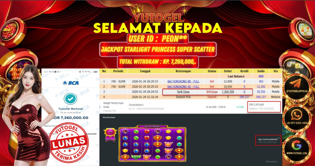 Selamat kepada USER ID : PE0N** Telah berhasil mendapatkan kemenangan besar pada YUTOGEL JACKPOT SLOT PRAGMATIC PLAY STARLIGHT PRINCESS SUPER SCATTER RP. 7.260.000,. – LUNAS. Setelah mengisi formulir withdraw dengan kurung waktu hanya 5 – 10 menit pihak sudah melakukan transfer kepada pemilik User id dan dana sudah dapat dicairkan oleh pemenang. Bukti pembayaran yang kami berikan merupakan bukti pembayaran yang SAH/VALID yang langsung di dapatkan melalui tanda transfer transaksi dari Bank yang dituju.
