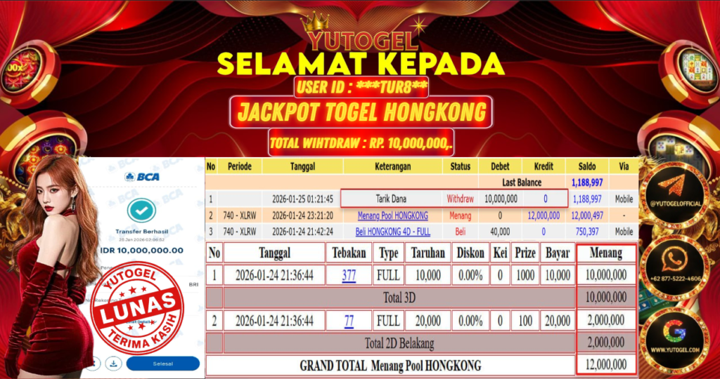 Selamat kepada User id : ***TUR8** Bukti Pembayaran Kemenangan 10.000,000 permainan TOGEL HONGKONG LOTTO USER ID : ***TUR8** LUNAS!!! Telah berhasil mendapatkan kemenangan besar pada JACKPOT PERMAINAN TOGEL HONGKONG LOTTO , RP 10.000,000,- LUNAS . Setelah mengisi formulir withdraw dengan kurung waktu hanya 5 – 10 menit pihak YUTOGEL sudah melakukan transfer kepada pemilik User id dan dana sudah dapat dicairkan oleh pemenang. Bukti pembayaran yang kami berikan merupakan bukti pembayaran yang SAH/VALID yang langsung di dapatkan melalui tanda transfer transaksi dari Bank yang dituju.
