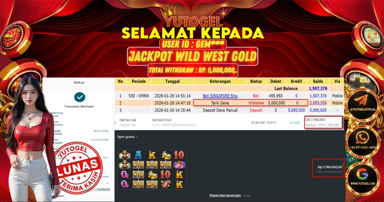 Selamat kepada USER ID : GEM*** Telah berhasil mendapatkan kemenangan besar pada YUTOGEL JACKPOT SLOT PRAGMATIC PLAY WILD WEST GOLD RP. 5.000.000,. – LUNAS. Setelah mengisi formulir withdraw dengan kurung waktu hanya 5 – 10 menit pihak  sudah melakukan transfer kepada pemilik User id dan dana sudah dapat dicairkan oleh pemenang. Bukti pembayaran yang kami berikan merupakan bukti pembayaran yang SAH/VALID yang langsung di dapatkan melalui tanda transfer transaksi dari Bank yang dituju.