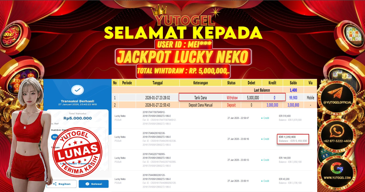 Selamat kepada USER ID : MEI*** Telah berhasil mendapatkan kemenangan besar pada YUTOGEL JACKPOT SLOT PGSOFT LUCKY NEKO RP. 5.000.000,. – LUNAS. Setelah mengisi formulir withdraw dengan kurung waktu hanya 5 – 10 menit pihak  sudah melakukan transfer kepada pemilik User id dan dana sudah dapat dicairkan oleh pemenang. Bukti pembayaran yang kami berikan merupakan bukti pembayaran yang SAH/VALID yang langsung di dapatkan melalui tanda transfer transaksi dari Bank yang dituju.