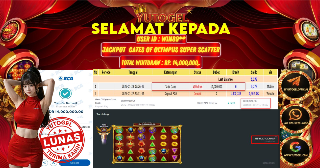 Selamat kepada USER ID : WIN89** Telah berhasil mendapatkan kemenangan besar pada YUTOGEL JACKPOT SLOT PRAGMATIC PLAY GATES OF OLYMPUS SUPER SCATTER RP. 14.000.000,. – LUNAS. Setelah mengisi formulir withdraw dengan kurung waktu hanya 5 – 10 menit pihak  sudah melakukan transfer kepada pemilik User id dan dana sudah dapat dicairkan oleh pemenang. Bukti pembayaran yang kami berikan merupakan bukti pembayaran yang SAH/VALID yang langsung di dapatkan melalui tanda transfer transaksi dari Bank yang dituju.