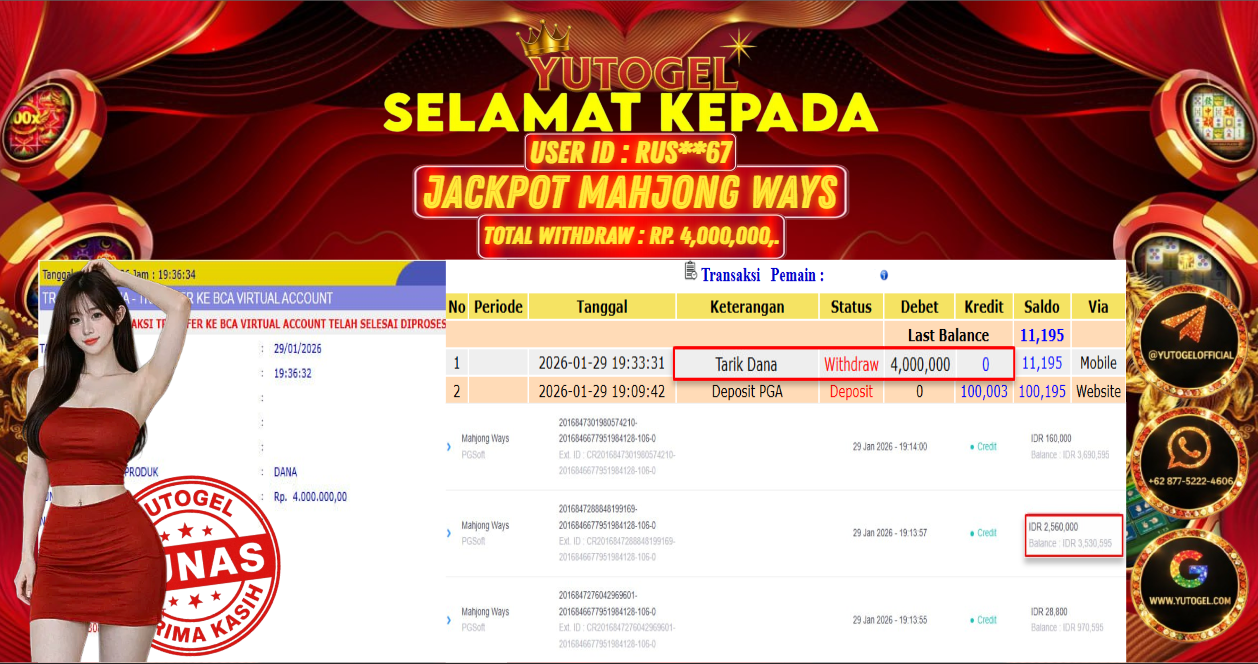 Selamat kepada USER ID : RUS**67 Telah berhasil mendapatkan kemenangan besar pada YUTOGEL JACKPOT SLOT PGSOFT MAHJONG WAYS RP. 4.000.000,. – LUNAS. Setelah mengisi formulir withdraw dengan kurung waktu hanya 5 – 10 menit pihak sudah melakukan transfer kepada pemilik User id dan dana sudah dapat dicairkan oleh pemenang. Bukti pembayaran yang kami berikan merupakan bukti pembayaran yang SAH/VALID yang langsung di dapatkan melalui tanda transfer transaksi dari Bank yang dituju.