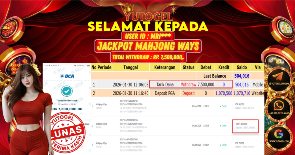 Selamat kepada USER ID : MRI*** Telah berhasil mendapatkan kemenangan besar pada YUTOGEL JACKPOT SLOT PGSOFT MAHJONG WAYS RP. 7.500.000,. – LUNAS. Setelah mengisi formulir withdraw dengan kurung waktu hanya 5 – 10 menit pihak  sudah melakukan transfer kepada pemilik User id dan dana sudah dapat dicairkan oleh pemenang. Bukti pembayaran yang kami berikan merupakan bukti pembayaran yang SAH/VALID yang langsung di dapatkan melalui tanda transfer transaksi dari Bank yang dituju.
