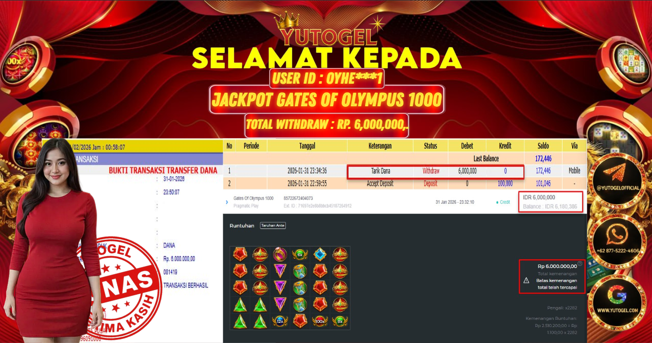 Selamat kepada USER ID : OYHE***1 Telah berhasil mendapatkan kemenangan besar pada YUTOGEL JACKPOT SLOT PRAGMATIC PLAY GATES OF OLYMPUS 1000 RP. 6.000.000,. – LUNAS. Setelah mengisi formulir withdraw dengan kurung waktu hanya 5 – 10 menit pihak  sudah melakukan transfer kepada pemilik User id dan dana sudah dapat dicairkan oleh pemenang. Bukti pembayaran yang kami berikan merupakan bukti pembayaran yang SAH/VALID yang langsung di dapatkan melalui tanda transfer transaksi dari Bank yang dituju.
