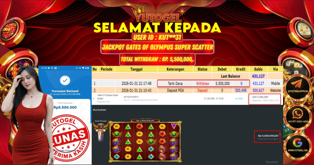 Selamat kepada USER ID : KUT**31 Telah berhasil mendapatkan kemenangan besar pada YUTOGEL JACKPOT SLOT PRAGMATIC PLAY GATES OF OLYMPUS SUPER SCATTER RP. 5.500.000,. – LUNAS. Setelah mengisi formulir withdraw dengan kurung waktu hanya 5 – 10 menit pihak sudah melakukan transfer kepada pemilik User id dan dana sudah dapat dicairkan oleh pemenang. Bukti pembayaran yang kami berikan merupakan bukti pembayaran yang SAH/VALID yang langsung di dapatkan melalui tanda transfer transaksi dari Bank yang dituju.