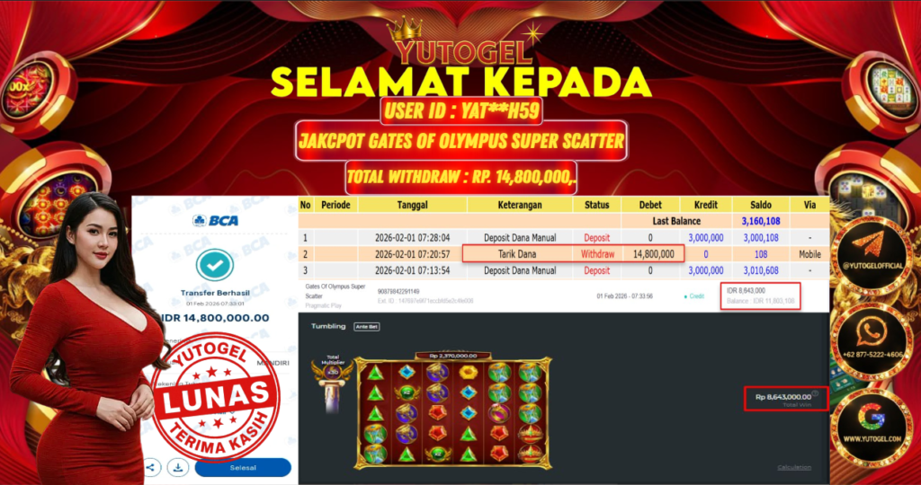 Selamat kepada USER ID : YAT**H59 Telah berhasil mendapatkan kemenangan besar pada YUTOGEL JACKPOT SLOT GATES OF OLYMPUS SUPER SCATTER RP. 14.800.000,. – LUNAS. Setelah mengisi formulir withdraw dengan kurung waktu hanya 5 – 10 menit pihak sudah melakukan transfer kepada pemilik User id dan dana sudah dapat dicairkan oleh pemenang. Bukti pembayaran yang kami berikan merupakan bukti pembayaran yang SAH/VALID yang langsung di dapatkan melalui tanda transfer transaksi dari Bank yang dituju.