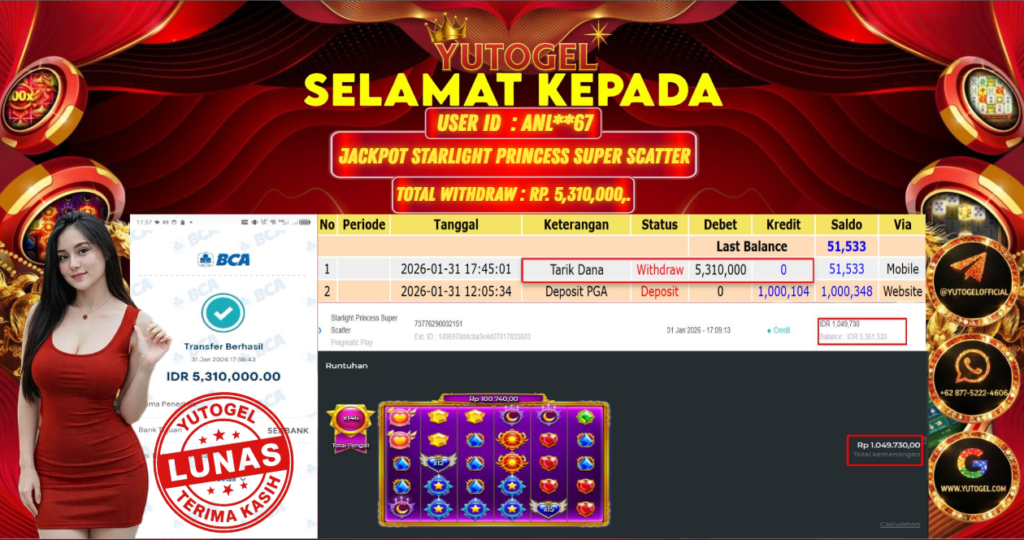 Selamat kepada USER ID : ANL**67 Telah berhasil mendapatkan kemenangan besar pada YUTOGEL JACKPOT SLOT PRAGMATIC PLAY STARLIGHT PRINCESS SUPER SCATTER RP. 5.310.000,. – LUNAS. Setelah mengisi formulir withdraw dengan kurung waktu hanya 5 – 10 menit pihak sudah melakukan transfer kepada pemilik User id dan dana sudah dapat dicairkan oleh pemenang. Bukti pembayaran yang kami berikan merupakan bukti pembayaran yang SAH/VALID yang langsung di dapatkan melalui tanda transfer transaksi dari Bank yang dituju.