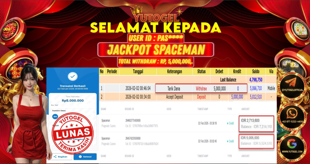 Selamat kepada USER ID : PAS**** Telah berhasil mendapatkan kemenangan besar pada YUTOGEL JACKPOT SLOT PRAGMATIC CASINO SPACEMAN RP. 5.000.000,. – LUNAS. Setelah mengisi formulir withdraw dengan kurung waktu hanya 5 – 10 menit pihak sudah melakukan transfer kepada pemilik Userid dan dana sudah dapat dicairkan oleh pemenang. Bukti pembayaran yang kami berikan merupakan bukti pembayaran yang SAH/VALID yang langsung di dapatkan melalui tanda transfer transaksi dari Bank yang dituju.