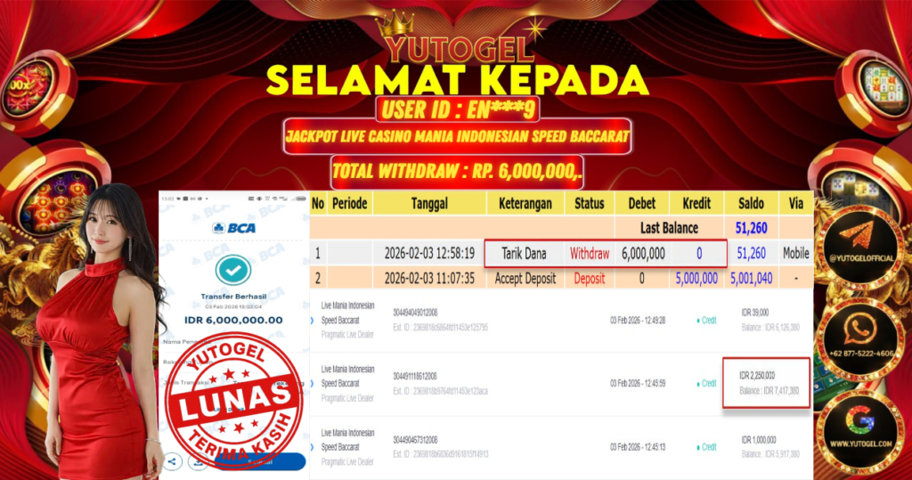 Selamat kepada USER ID : EN***9 Telah berhasil mendapatkan kemenangan besar pada YUTOGEL JACKPOT MANIA INDONESIAN SPEED BACCARAT LIVE GAMES RP. 6.000.000,. – LUNAS. Setelah mengisi formulir withdraw dengan kurung waktu hanya 5 – 10 menit pihak sudah melakukan transfer kepada pemilik User id dan dana sudah dapat dicairkan oleh pemenang. Bukti pembayaran yang kami berikan merupakan bukti pembayaran yang SAH/VALID yang langsung di dapatkan melalui tanda transfer transaksi dari Bank yang dituju.
