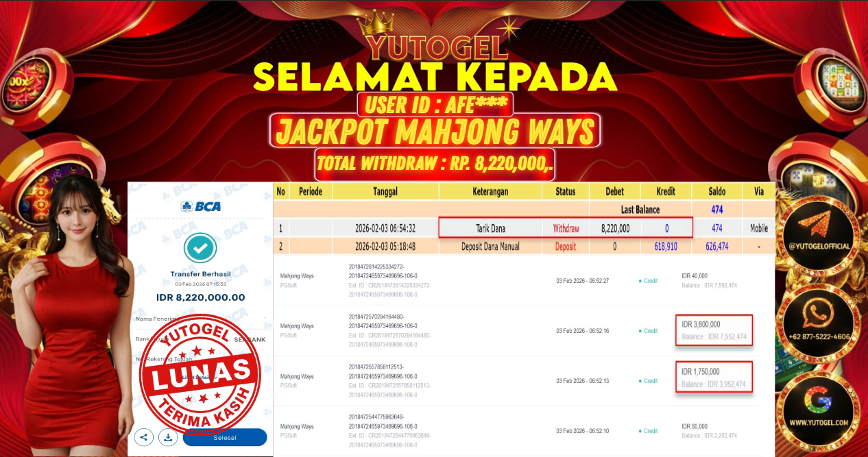 Selamat kepada USER ID : AFE*** Telah berhasil mendapatkan kemenangan besar pada YUTOGEL JACKPOT SLOT PGSOFT MAHJONG WAYS RP. 8.220.000,. – LUNAS. Setelah mengisi formulir withdraw dengan kurung waktu hanya 5 – 10 menit pihak  sudah melakukan transfer kepada pemilik User id dan dana sudah dapat dicairkan oleh pemenang. Bukti pembayaran yang kami berikan merupakan bukti pembayaran yang SAH/VALID yang langsung di dapatkan melalui tanda transfer transaksi dari Bank yang dituju.
