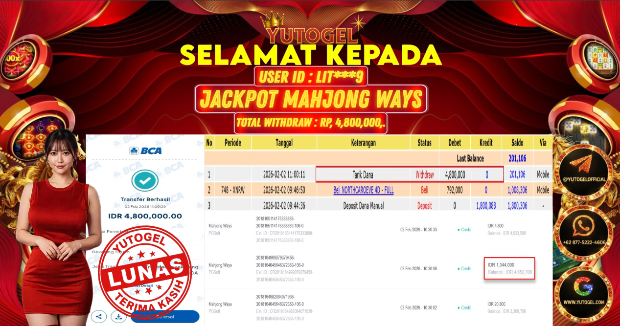 Selamat kepada USER ID : LIT***9 Telah berhasil mendapatkan kemenangan besar pada YUTOGEL JACKPOT SLOT PGSOFT MAHJONG WAYS RP. 4.800.000,. – LUNAS. Setelah mengisi formulir withdraw dengan kurung waktu hanya 5 – 10 menit pihak  sudah melakukan transfer kepada pemilik User id dan dana sudah dapat dicairkan oleh pemenang. Bukti pembayaran yang kami berikan merupakan bukti pembayaran yang SAH/VALID yang langsung di dapatkan melalui tanda transfer transaksi dari Bank yang dituju.