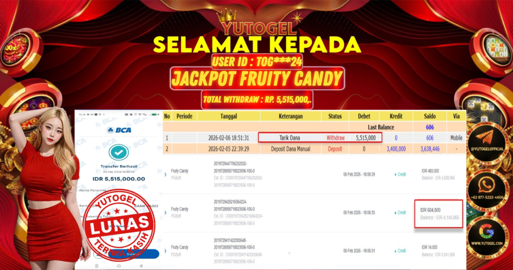 Selamat kepada USER ID : TOG***24 Telah berhasil mendapatkan kemenangan besar pada YUTOGEL JACKPOT SLOT PGSOFT FRUITY CANDY RP. 5.515.000,. – LUNAS. Setelah mengisi formulir withdraw dengan kurung waktu hanya 5 – 10 menit pihak sudah melakukan transfer kepada pemilik User id dan dana sudah dapat dicairkan oleh pemenang. Bukti pembayaran yang kami berikan merupakan bukti pembayaran yang SAH/VALID yang langsung di dapatkan melalui tanda transfer transaksi dari Bank yang dituju.