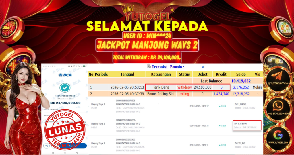Selamat kepada USER ID : MIN***24 Telah berhasil mendapatkan kemenangan besar pada YUTOGEL JACKPOT SLOT PGSOFT MAHJONG WAYS 2 RP. 24.100.000,. – LUNAS. Setelah mengisi formulir withdraw dengan kurung waktu hanya 5 – 10 menit pihak sudah melakukan transfer kepada pemilik User id dan dana sudah dapat dicairkan oleh pemenang. Bukti pembayaran yang kami berikan merupakan bukti pembayaran yang SAH/VALID yang langsung di dapatkan melalui tanda transfer transaksi dari Bank yang dituju.