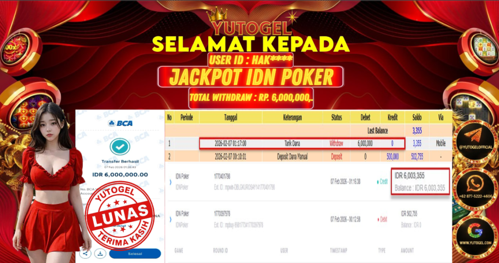 Selamat kepada USER ID : HAK**** Telah berhasil mendapatkan kemenangan besar pada YUTOGEL JACKPOT LIVE CASINO IDN POKER RP. 6.000.000,. – LUNAS. Setelah mengisi formulir withdraw dengan kurung waktu hanya 5 – 10 menit pihak sudah melakukan transfer kepada pemilik User id dan dana sudah dapat dicairkan oleh pemenang. Bukti pembayaran yang kami berikan merupakan bukti pembayaran yang SAH/VALID yang langsung di dapatkan melalui tanda transfer transaksi dari Bank yang dituju.