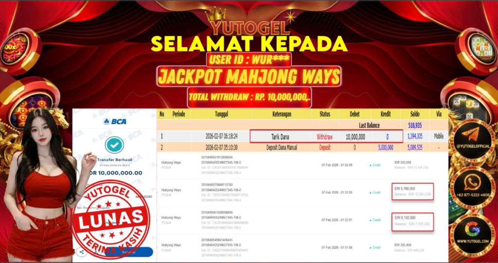 Selamat kepada USER ID : WUR*** Telah berhasil mendapatkan kemenangan besar pada YUTOGEL JACKPOT SLOT PGSOFT MAHJONG WAYS RP. 10.000.000,. – LUNAS. Setelah mengisi formulir withdraw dengan kurung waktu hanya 5 – 10 menit pihak sudah melakukan transfer kepada pemilik User id dan dana sudah dapat dicairkan oleh pemenang. Bukti pembayaran yang kami berikan merupakan bukti pembayaran yang SAH/VALID yang langsung di dapatkan melalui tanda transfer transaksi dari Bank yang dituju.