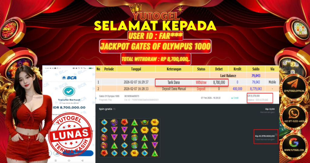 Selamat kepada USER ID : FAR*** Telah berhasil mendapatkan kemenangan besar pada YUTOGEL JACKPOT SLOT PRAGMATIC PLAY GATES OF OLYMPUS 1000 RP. 8.700.000,. – LUNAS. Setelah mengisi formulir withdraw dengan kurung waktu hanya 5 – 10 menit pihak sudah melakukan transfer kepada pemilik User id dan dana sudah dapat dicairkan oleh pemenang. Bukti pembayaran yang kami berikan merupakan bukti pembayaran yang SAH/VALID yang langsung di dapatkan melalui tanda transfer transaksi dari Bank yang dituju.