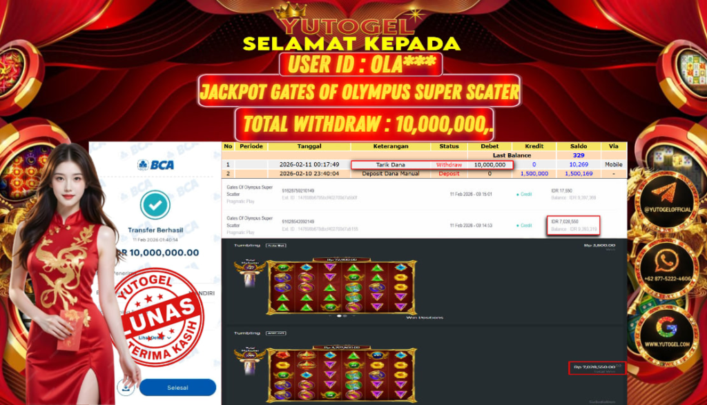 Selamat kepada USER ID : OLA*** Telah berhasil mendapatkan kemenangan besar pada YUTOGEL JACKPOT SLOT PRAGMATIC PLAY GATES OF OLYMPUS SUPER SCATER RP. 10.000.000,. – LUNAS. Setelah mengisi formulir withdraw dengan kurung waktu hanya 5 – 10 menit pihak sudah melakukan transfer kepada pemilik User id dan dana sudah dapat dicairkan oleh pemenang. Bukti pembayaran yang kami berikan merupakan bukti pembayaran yang SAH/VALID yang langsung di dapatkan melalui tanda transfer transaksi dari Bank yang dituju.