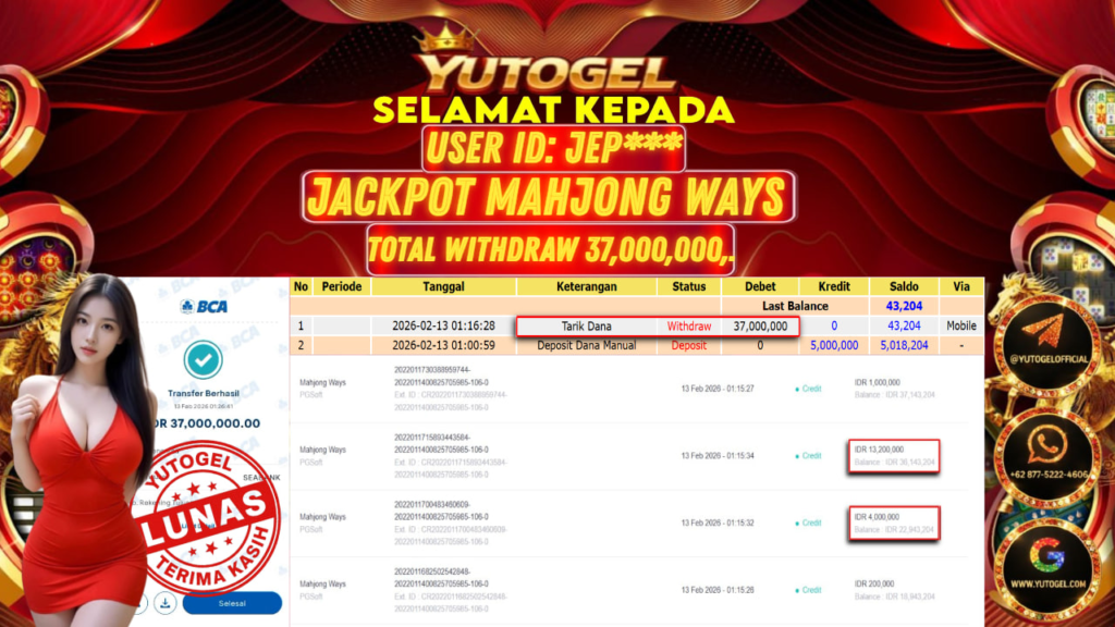 Selamat kepada USER ID : JEP*** Telah berhasil mendapatkan kemenangan besar pada YUTOGEL JACKPOT PG SHOFT MAHJONG WAYS RP. 37.000.000,. – LUNAS. Setelah mengisi formulir withdraw dengan kurung waktu hanya 5 – 10 menit pihak sudah melakukan transfer kepada pemilik User id dan dana sudah dapat dicairkan oleh pemenang. Bukti pembayaran yang kami berikan merupakan bukti pembayaran yang SAH/VALID yang langsung di dapatkan melalui tanda transfer transaksi dari Bank yang dituju.