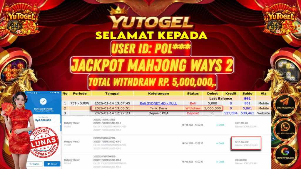 Selamat kepada USER ID : POL*** Telah berhasil mendapatkan kemenangan besar pada YUTOGEL JACKPOT PG SHOFT MAHJONG WAYS 2 RP. 5.000.000,. – LUNAS. Setelah mengisi formulir withdraw dengan kurung waktu hanya 5 – 10 menit pihak sudah melakukan transfer kepada pemilik User id dan dana sudah dapat dicairkan oleh pemenang. Bukti pembayaran yang kami berikan merupakan bukti pembayaran yang SAH/VALID yang langsung di dapatkan melalui tanda transfer transaksi dari Bank yang dituju.