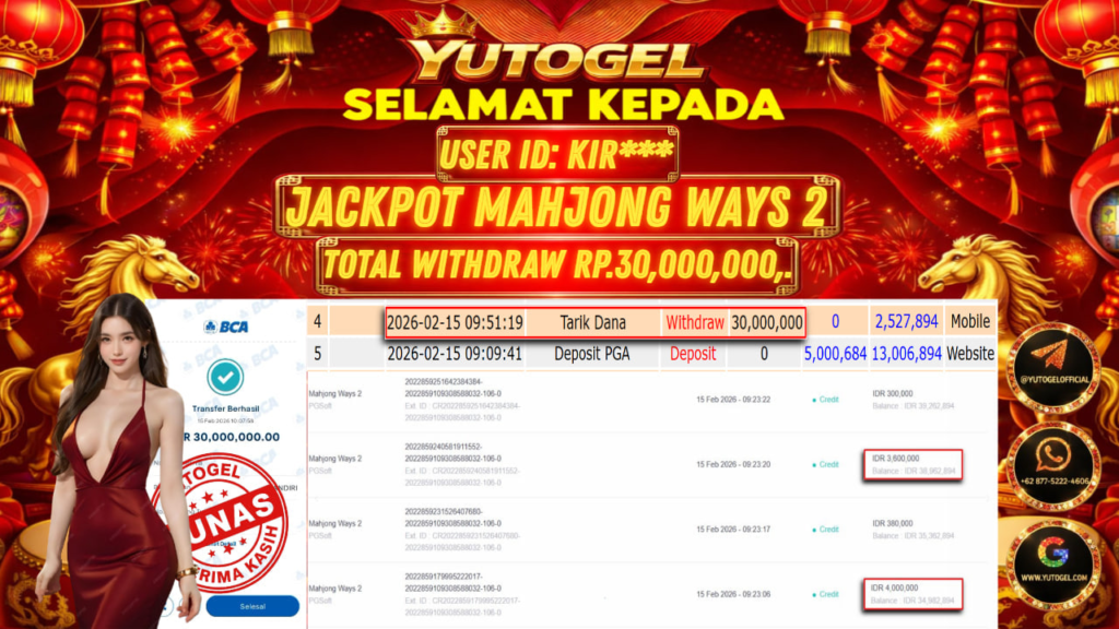 Selamat kepada USER ID : KIR*** Telah berhasil mendapatkan kemenangan besar pada YUTOGEL JACKPOT PG SHOFT MAHJONG WAYS 2 RP. 30.000.000,. – LUNAS. Setelah mengisi formulir withdraw dengan kurung waktu hanya 5 – 10 menit pihak sudah melakukan transfer kepada pemilik User id dan dana sudah dapat dicairkan oleh pemenang. Bukti pembayaran yang kami berikan merupakan bukti pembayaran yang SAH/VALID yang langsung di dapatkan melalui tanda transfer transaksi dari Bank yang dituju.