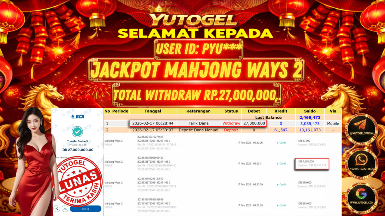 Selamat kepada USER ID : PYU*** Telah berhasil mendapatkan kemenangan besar pada YUTOGEL JACKPOT PG SHOFT MAHJONG WAYS 2 RP. 27.000.000,. – LUNAS. Setelah mengisi formulir withdraw dengan kurung waktu hanya 5 – 10 menit pihak sudah melakukan transfer kepada pemilik User id dan dana sudah dapat dicairkan oleh pemenang. Bukti pembayaran yang kami berikan merupakan bukti pembayaran yang SAH/VALID yang langsung di dapatkan melalui tanda transfer transaksi dari Bank yang dituju.