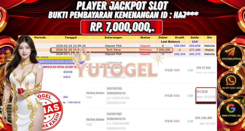 Selamat kepada USER ID : HAJ*** Telah berhasil mendapatkan kemenangan besar pada YUTOGEL JACKPOT PG SHOFT WILD BOUNTY SHOWDOWN RP. 7.000.000,. – LUNAS. Setelah mengisi formulir withdraw dengan kurung waktu hanya 5 – 10 menit pihak sudah melakukan transfer kepada pemilik User id dan dana sudah dapat dicairkan oleh pemenang. Bukti pembayaran yang kami berikan merupakan bukti pembayaran yang SAH/VALID yang langsung di dapatkan melalui tanda transfer transaksi dari Bank yang dituju.