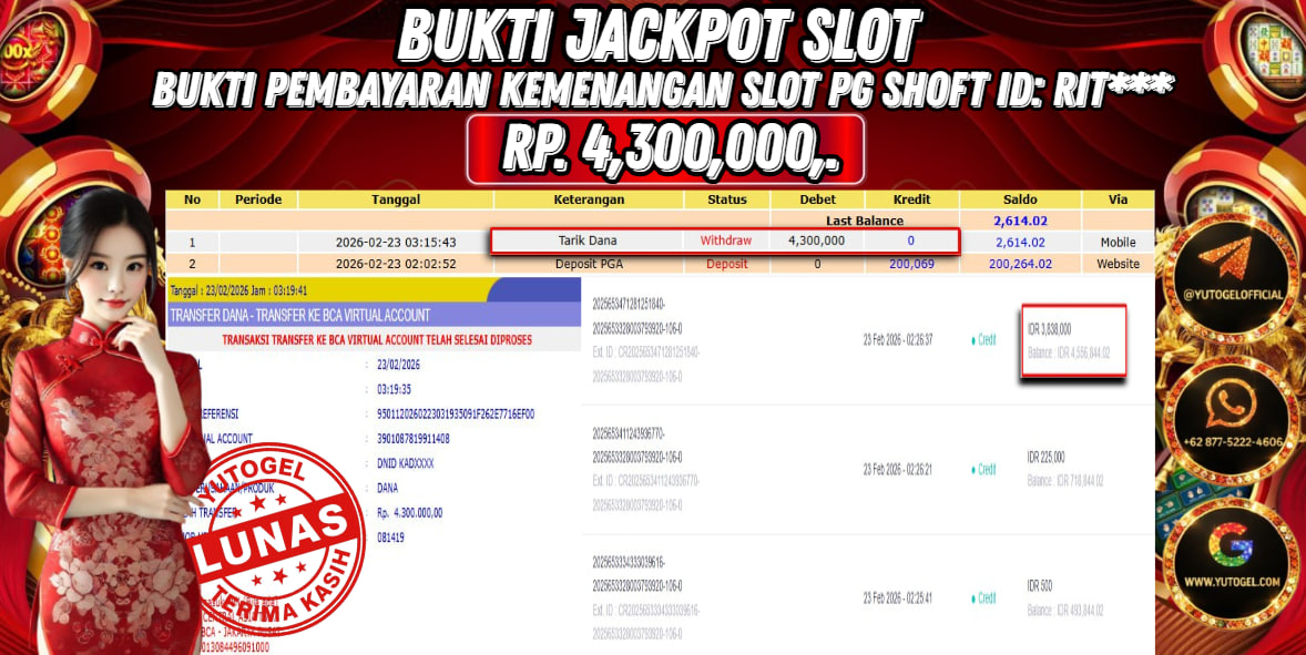 Selamat kepada USER ID : RIT*** Telah berhasil mendapatkan kemenangan besar pada YUTOGEL JACKPOT PG SHOFT WILD BOUNTY SHOWDOWN RP. 4.300.000,. – LUNAS. Setelah mengisi formulir withdraw dengan kurung waktu hanya 5 – 10 menit pihak  sudah melakukan transfer kepada pemilik User id dan dana sudah dapat dicairkan oleh pemenang. Bukti pembayaran yang kami berikan merupakan bukti pembayaran yang SAH/VALID yang langsung di dapatkan melalui tanda transfer transaksi dari Bank yang dituju.