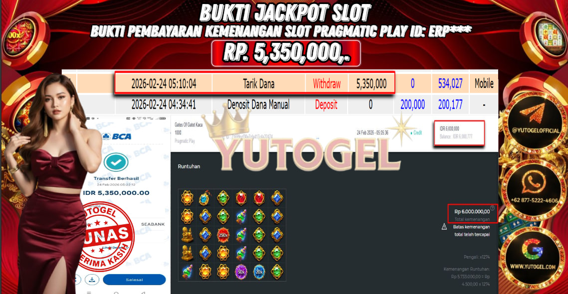 Selamat kepada USER ID : ERP*** Telah berhasil mendapatkan kemenangan besar pada YUTOGEL JACKPOT PRAGMATIC PLAY GATES OF GATOT KACA 1000 RP. 5.350.000,. – LUNAS. Setelah mengisi formulir withdraw dengan kurung waktu hanya 5 – 10 menit pihak  sudah melakukan transfer kepada pemilik User id dan dana sudah dapat dicairkan oleh pemenang. Bukti pembayaran yang kami berikan merupakan bukti pembayaran yang SAH/VALID yang langsung di dapatkan melalui tanda transfer transaksi dari Bank yang dituju.