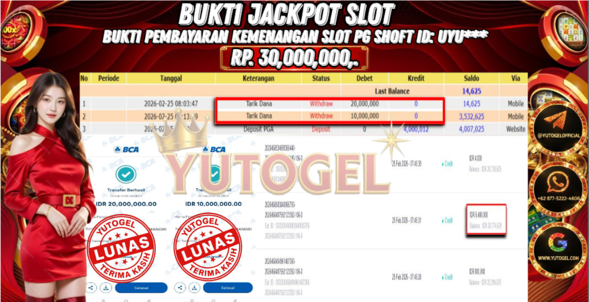 Selamat kepada USER ID : UYU*** Telah berhasil mendapatkan kemenangan besar pada YUTOGEL JACKPOT PG SHOFT MAHJONG WAYS RP. 30.000.000,. – LUNAS. Setelah mengisi formulir withdraw dengan kurung waktu hanya 5 – 10 menit pihak sudah melakukan transfer kepada pemilik User id dan dana sudah dapat dicairkan oleh pemenang. Bukti pembayaran yang kami berikan merupakan bukti pembayaran yang SAH/VALID yang langsung di dapatkan melalui tanda transfer transaksi dari Bank yang dituju.
