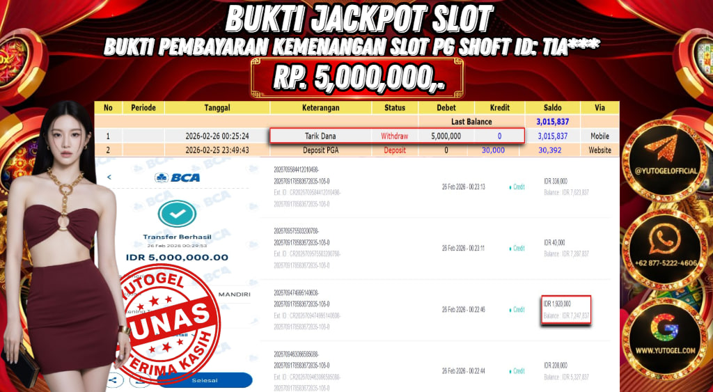 Selamat kepada USER ID : TIA*** Telah berhasil mendapatkan kemenangan besar pada YUTOGEL JACKPOT PG SHOFT LUCKY NECKO RP. 5.000.000,. – LUNAS. Setelah mengisi formulir withdraw dengan kurung waktu hanya 5 – 10 menit pihak  sudah melakukan transfer kepada pemilik User id dan dana sudah dapat dicairkan oleh pemenang. Bukti pembayaran yang kami berikan merupakan bukti pembayaran yang SAH/VALID yang langsung di dapatkan melalui tanda transfer transaksi dari Bank yang dituju.