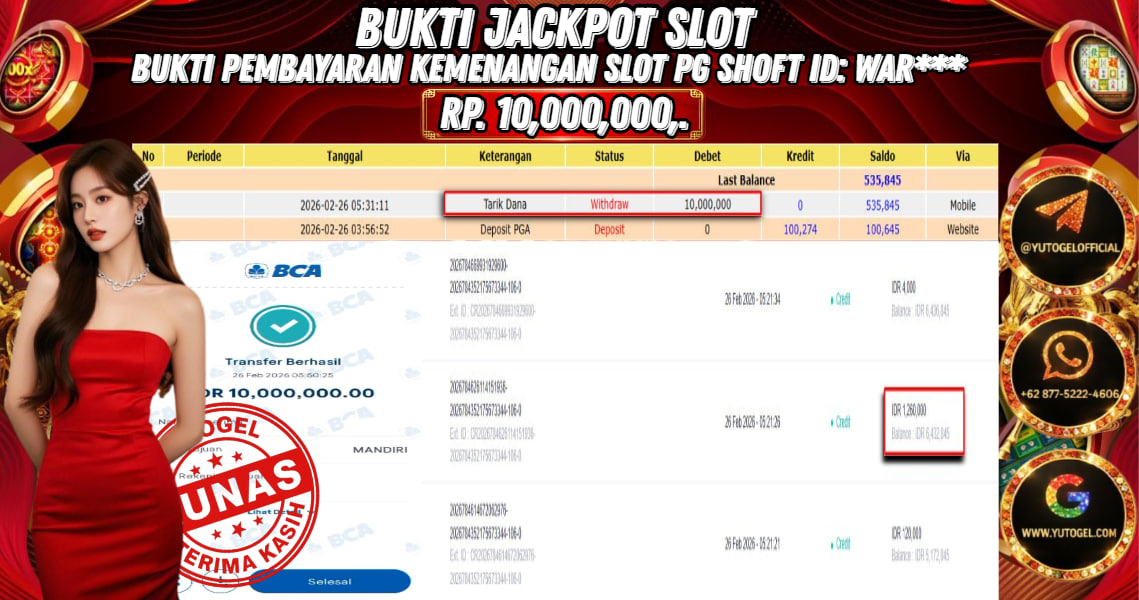 Selamat kepada USER ID : WAR*** Telah berhasil mendapatkan kemenangan besar pada YUTOGEL JACKPOT PG SHOFT MAHJONG WAYS RP. 10.000.000,. – LUNAS. Setelah mengisi formulir withdraw dengan kurung waktu hanya 5 – 10 menit pihak sudah melakukan transfer kepada pemilik User id dan dana sudah dapat dicairkan oleh pemenang. Bukti pembayaran yang kami berikan merupakan bukti pembayaran yang SAH/VALID yang langsung di dapatkan melalui tanda transfer transaksi dari Bank yang dituju.