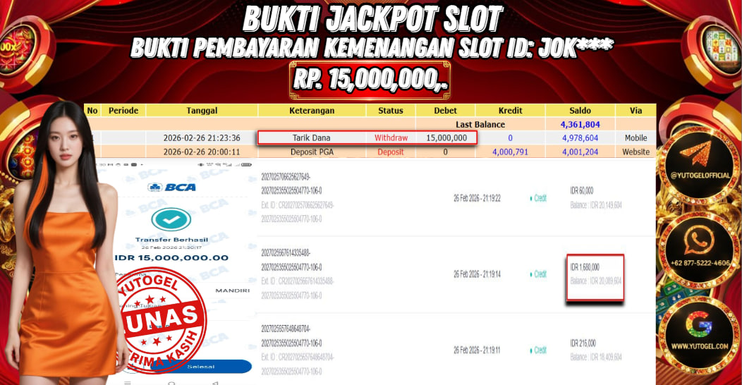 Selamat kepada USER ID : JOK*** Telah berhasil mendapatkan kemenangan besar pada YUTOGEL JACKPOT PG SHOFT WAYS OF QILIN RP. 15.000.000,. – LUNAS. Setelah mengisi formulir withdraw dengan kurung waktu hanya 5 – 10 menit pihak sudah melakukan transfer kepada pemilik User id dan dana sudah dapat dicairkan oleh pemenang. Bukti pembayaran yang kami berikan merupakan bukti pembayaran yang SAH/VALID yang langsung di dapatkan melalui tanda transfer transaksi dari Bank yang dituju.