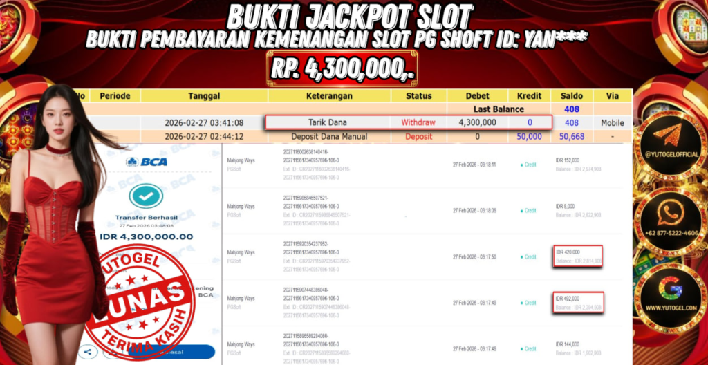 Selamat kepada USER ID : YAN*** Telah berhasil mendapatkan kemenangan besar pada YUTOGEL JACKPOT PG SHOFT MAHJONG WAYS RP. 4.300.000,. – LUNAS. Setelah mengisi formulir withdraw dengan kurung waktu hanya 5 – 10 menit pihak  sudah melakukan transfer kepada pemilik User id dan dana sudah dapat dicairkan oleh pemenang. Bukti pembayaran yang kami berikan merupakan bukti pembayaran yang SAH/VALID yang langsung di dapatkan melalui tanda transfer transaksi dari Bank yang dituju.