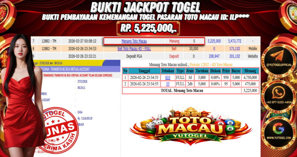 Selamat kepada USER ID : ILP*** Telah berhasil mendapatkan kemenangan besar pada YUTOGEL JACKPOT TOGEL TOTO MACAU RP. 5.225.000,. – LUNAS. Setelah mengisi formulir withdraw dengan kurung waktu hanya 5 – 10 menit pihak sudah melakukan transfer kepada pemilik User id dan dana sudah dapat dicairkan oleh pemenang. Bukti pembayaran yang kami berikan merupakan bukti pembayaran yang SAH/VALID yang langsung di dapatkan melalui tanda transfer transaksi dari Bank yang dituju.