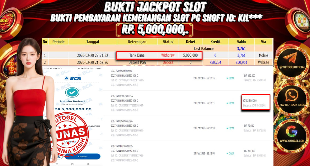 Selamat kepada USER ID : KIL*** Telah berhasil mendapatkan kemenangan besar pada YUTOGEL JACKPOT PG SHOFT MAHJONG WAYS RP. 5.000.000,. – LUNAS. Setelah mengisi formulir withdraw dengan kurung waktu hanya 5 – 10 menit pihak sudah melakukan transfer kepada pemilik User id dan dana sudah dapat dicairkan oleh pemenang. Bukti pembayaran yang kami berikan merupakan bukti pembayaran yang SAH/VALID yang langsung di dapatkan melalui tanda transfer transaksi dari Bank yang dituju.